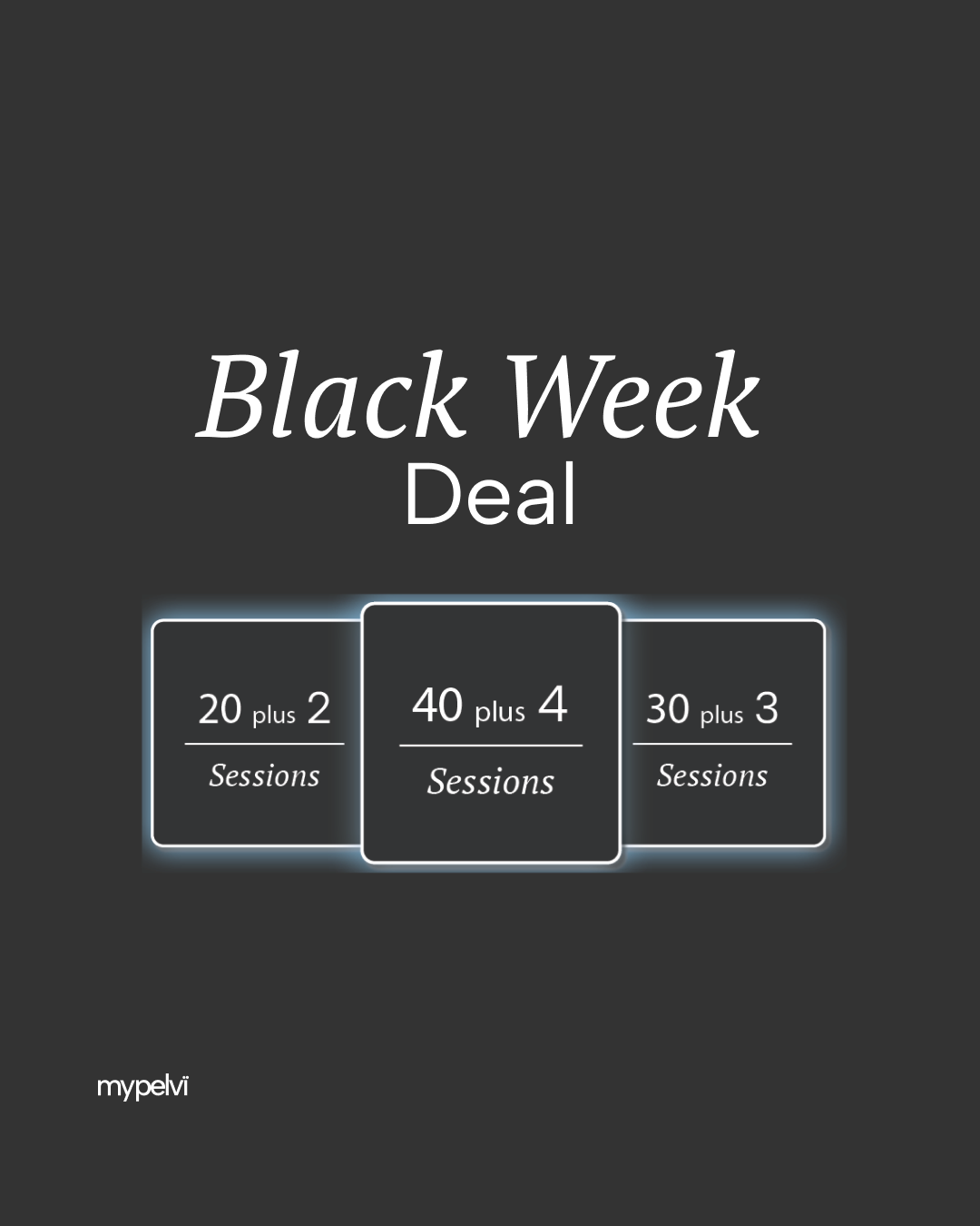 *Kaufe dir jetzt ein MyPelvi Anwendungskontingent und profitiere von unserem Black Friday Angebot. Sichere dir bei einem Kauf von 20 Sessions zwei, bei 30 Sessions drei und bei 40 Sessions vier zusätzliche Trainingseinheiten. Je nach gewähltem Kontingent fallen Kosten ab XX Euro an. Das Angebot gilt vom 24.11.2025 bis zum 01.12.2025 und ist nicht mit anderen Angeboten kombinierbar.