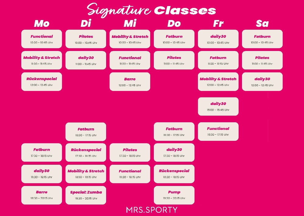 Wir unterstützen dich bei Mrs.Sporty Bodenheim das ganze Jahr über dabei, deine individuellen Ziele zu erreichen. Ganz egal, ob du lieber vormittags, nachmittags oder abends trainierst – es warten tolle Gruppenkurse auf dich. Du möchtest deine Tiefenmuskulatur stärken, abnehmen, an der Haltung arbeiten oder Körper, Geist und Seele in Einklang bringen? Oder interessierst du dich insbesondere für Kurse, in denen der Rücken im Vordergrund steht?