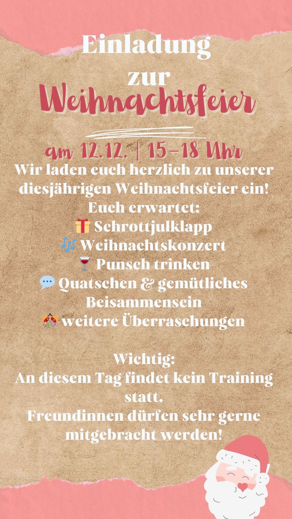 Weihnachtsfeier 12.12., 15–18 Uhr: kein Training, Freundinnen willkommen
