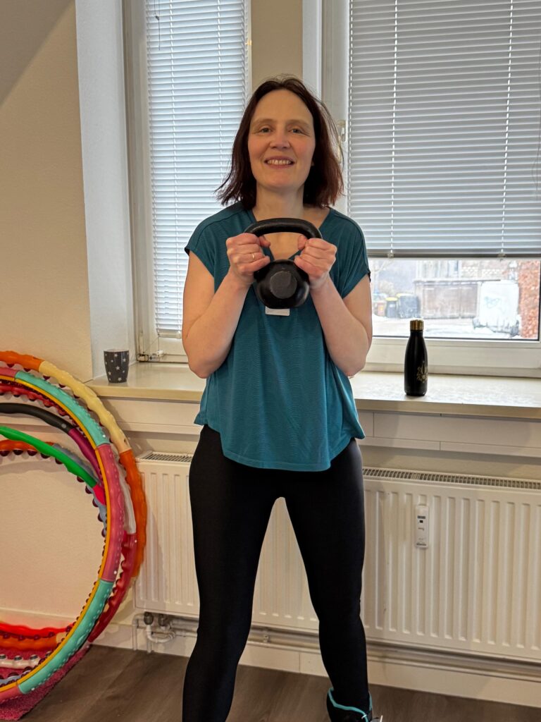 Abnehmen war nie mein Hauptziel, eher mein Gewicht zu halten. Ich trainiere besonders gern mit Hanteln und der Kettlebell, da merke ich meine Fortschritte am meisten – auch wenn Planks nicht meine Lieblingsübung sind.